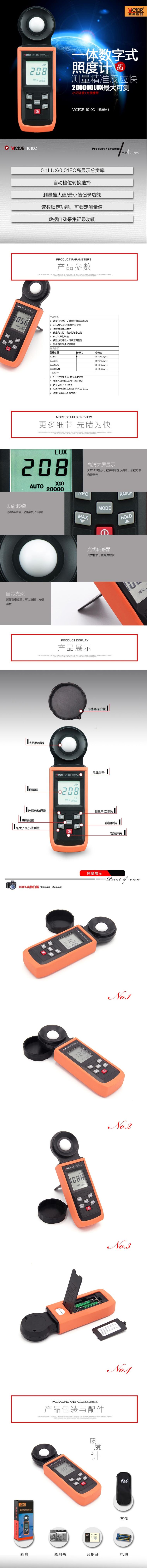 产品型号:VICTOR 1010C操作方式:自动量程产品名称:数字式照度计VICTOR 1010C显示位数:3 1 2位产品特点1.测量范围宽广,最大可测200