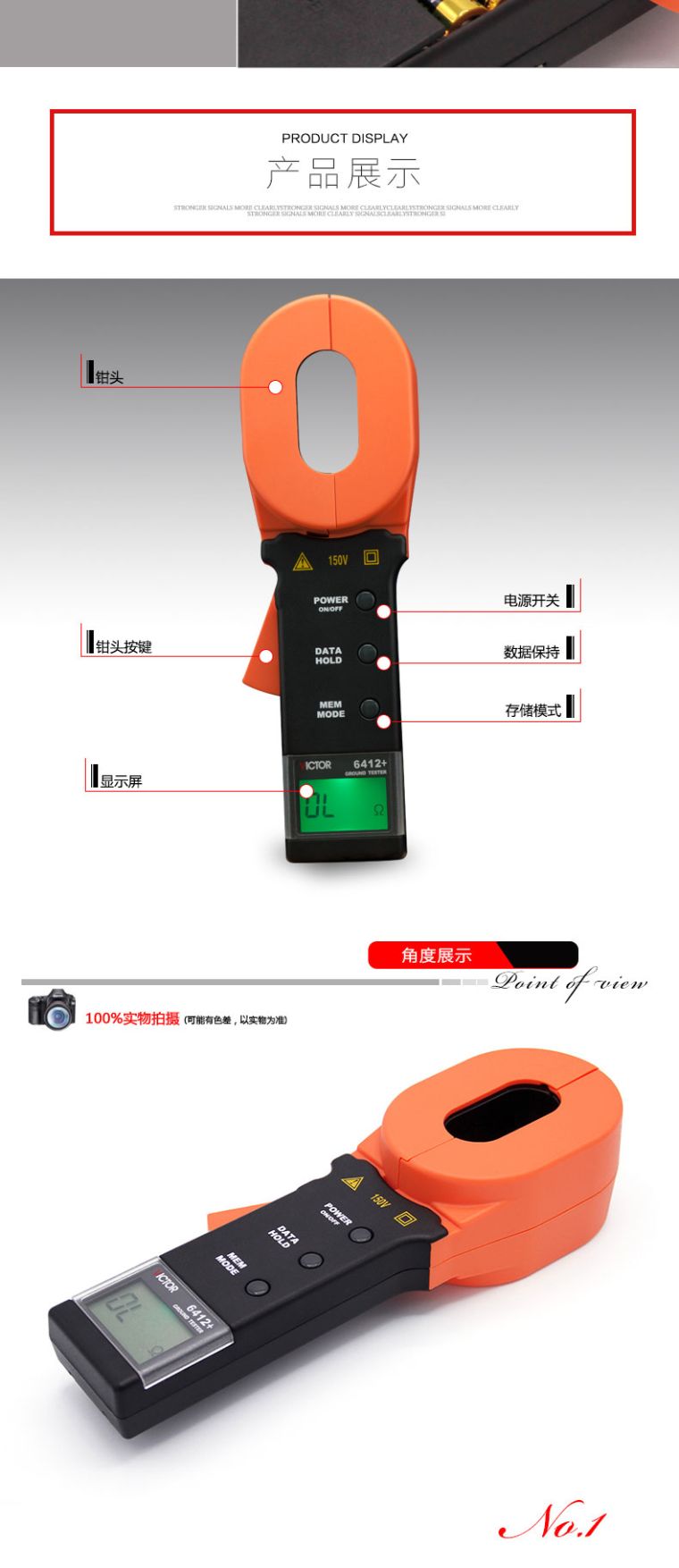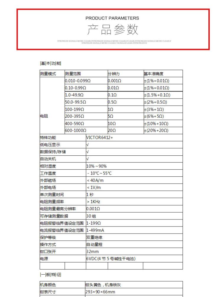 产品型号:VICTOR 6412+ 操作方式:自动量程产品名称:接地电阻测试仪VICTOR 6412+ 显示位数:3 1 2位|基|本|功|能|测量模式测量范