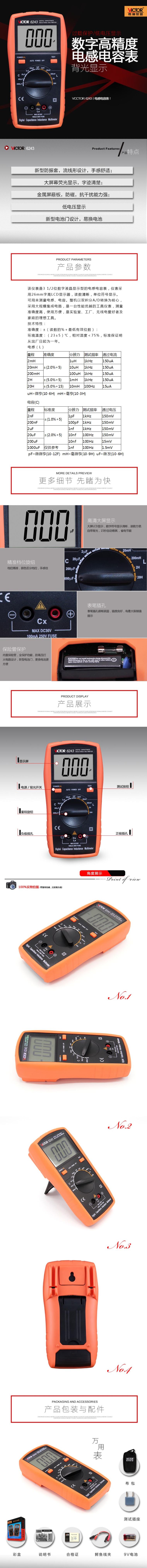 产品型号:VICTOR 6243操作方式:手动量程产品名称:数字电感电容表VICTOR 6243显示位数:3 1 2位该仪表是3 1 2位数字液晶显示型的电感