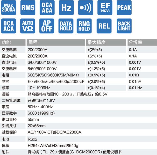 ■ 最大可测量AC2000A(真有效值),并搭载了万用表功能