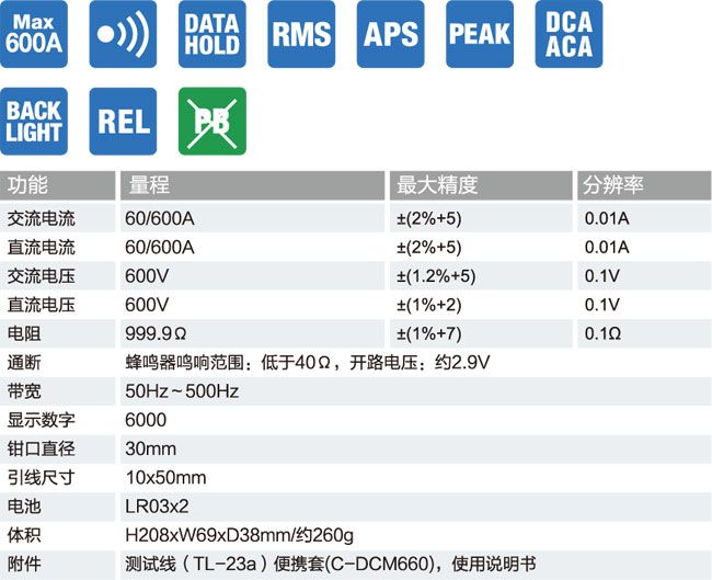 ■ 最大可测量交直流电流600A , 最高分辨率0.01A