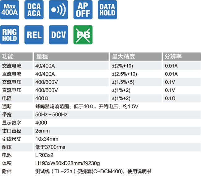 ■ 最大可测量交直流电流400A , 最高分辨率0.01A