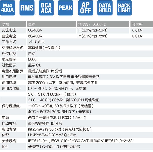 ■ 最大可测量交直流电流400A,最高分辨率0.01A