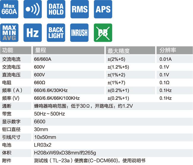 ■ 最大可测量交流电流660A , 最高分辨率0.01A