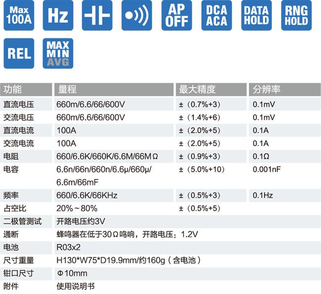 ■ 3-5/6位6600数据点,大屏幕液晶显示屏,增强了可读性■ 具有交直流电流、交直流电压、电阻、电容、频率、占空比和二极管测试功能