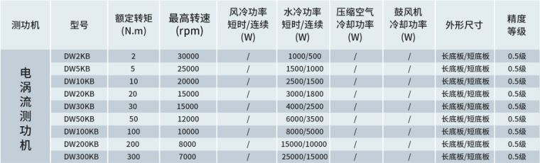 DW系列电涡流测功机适用于高转速、中到高功率的电机测试。电涡流测功机的扭力随着转速的提高而加大,并在额定转速时达到扭力峰值,由于转子直径较小,电涡流测功机具有较低的惯性。其冷却方式是通过定子的内循环水冷却系统带走制动时所产生的热量,由于采用水冷却方式,DW系列电涡流测功机具有极高的连续测试功率(最大功率为45KW,超大功率可定制)。根据测功机的大小与系统组成,DW系列电涡流测功机的精确度为:转速:±0.2%,转矩:±0.5%。