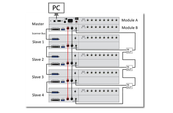 效能再进化 快速且简易地扩充测试,同时将效率再进化。可提供80个输出通道供测试切换 (1台master搭配4台slave)。 |