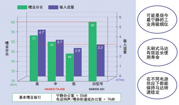 | 图注: HAKKO FA-430设定在Medium风量时, 吸入流量跟旧型号的相约, 但操作噪音却明显减少。设定在High风量时, 操作噪音也相比起旧型号的少。