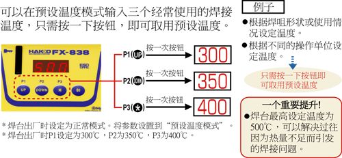 如果发现使用焊台之标准模式焊接电源线路板,多层电路板,散热器,屏蔽外壳等需要大热容量之作业效率不足时,可将焊台调至高功率模式来强化焊接效率。 * 当使用高功率模式时,焊咀温度可能会波动。