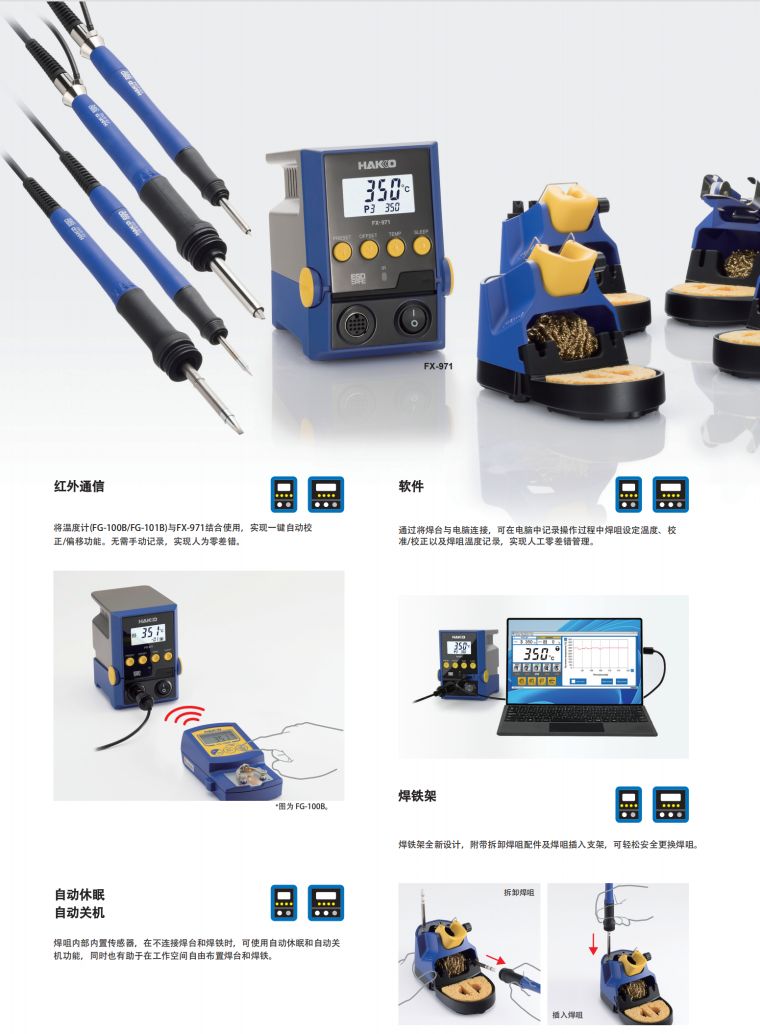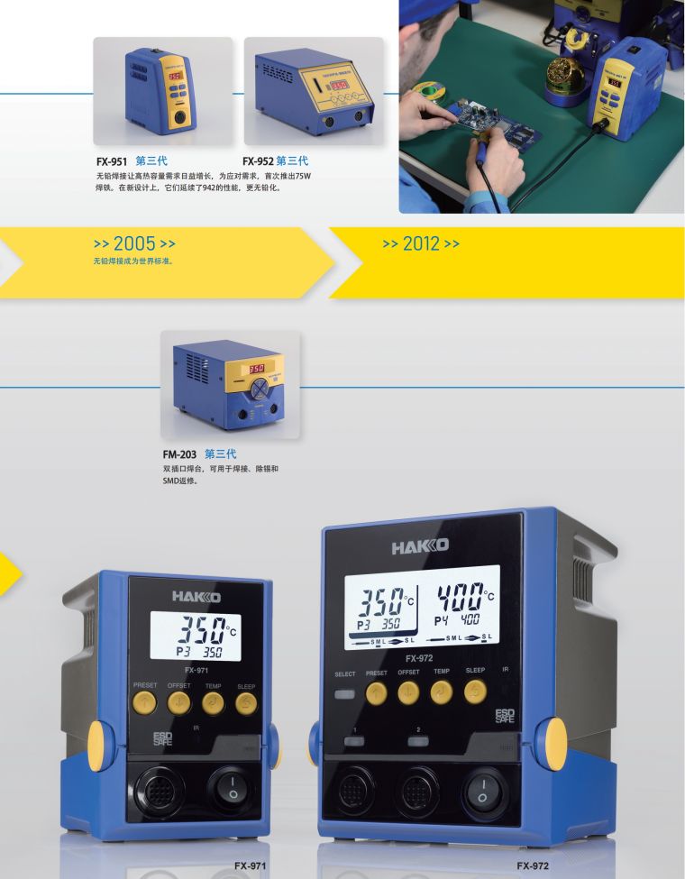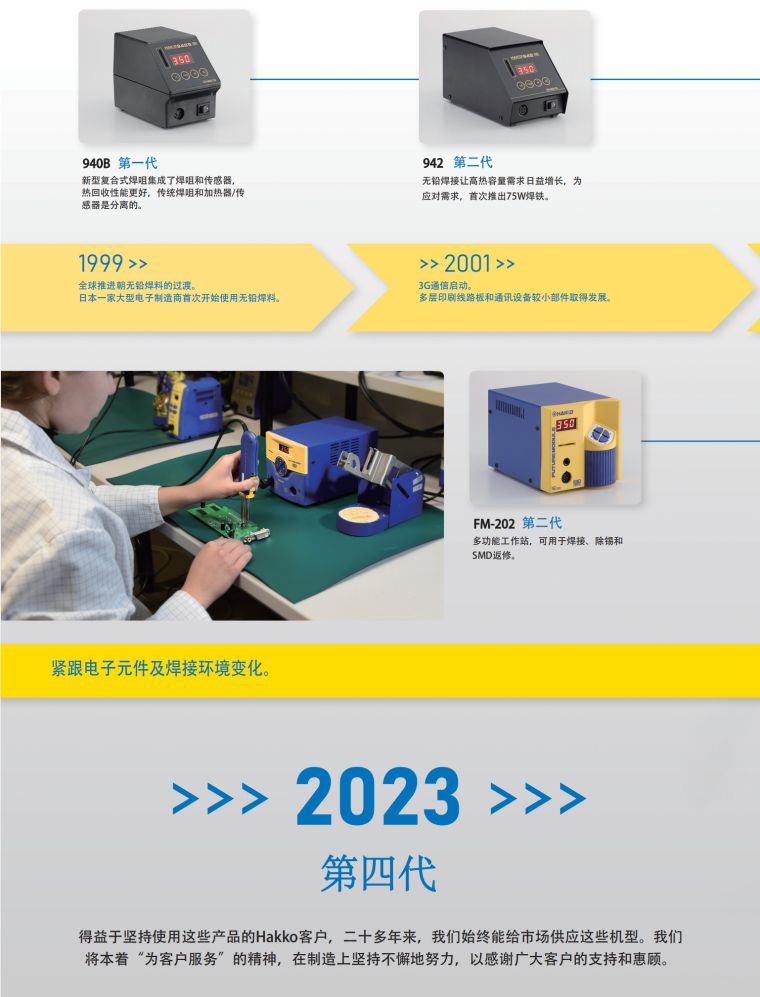 多年来,“ HAKKO标准” 一直推进焊接行业前行,目前,“ HAKKO标准” 也在发展。 后续,我们会继续支持各种制造场所,如实验室、研发、生产、返修等。