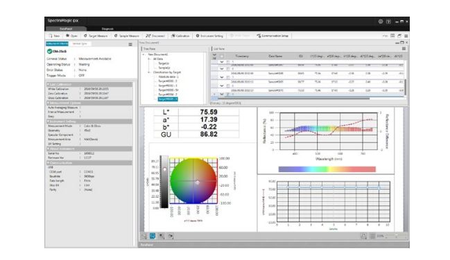 使用全新的色彩管理软件 SpectraMagic DX可轻松管理测量数据,使用户仅通过屏幕即可配置各种项目,如数据列表、光谱图、色差图、合格/不合格显示等。