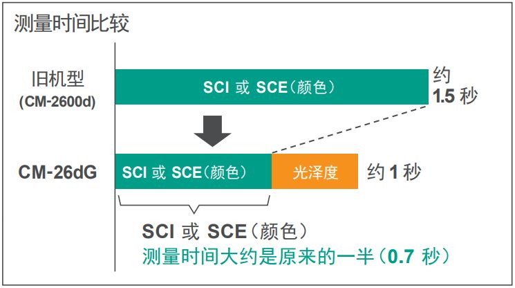 CM-26dG测量颜色所需的时间约为旧机型的一半,仅 0. 7秒 (SCI或 SCE)。此外,同时测量颜色和光泽仅需约 1秒 (SCI或 SCE +光泽度)。测量速度越快,工作效率提高。