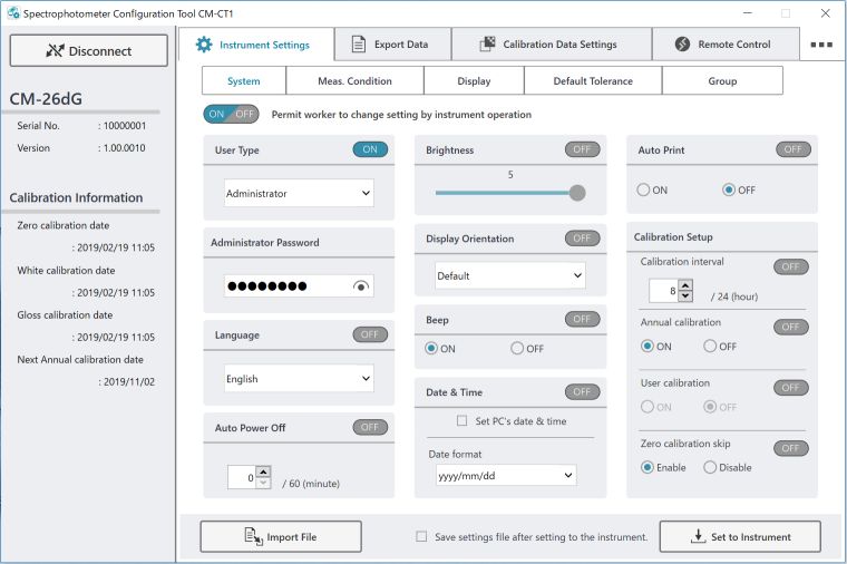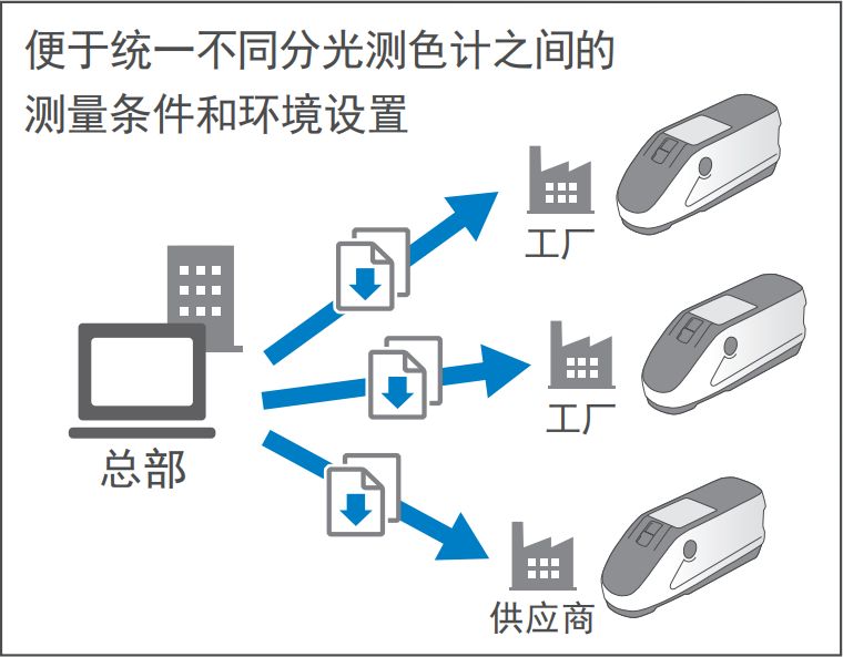 由于供应链系统不断被构建和完善,数据需要在更多的生产现场间共享。重复性与器间差成为衡量便携式分光测色计性能的主要指标。CM-26dG和CM-26d的器间差仅为ΔE*ab0.12(12块 BCRA系列色板的平均值),与市场上所有便捷式分光测色计相比具有显著优势。在测量光泽度时,CM-26dG的器间差介于±0.2GU(0-10 GU)或 ±0.5 GU (10-100 GU)。此外,重复性较旧机型提升50%,达到 σΔE*ab0.02。出众的性能促进了数字化彩色数据管理,从而有助于制造商加强其工厂和供应商之间的质量管理。<快速易用的分光测色计配置软件 cm-ct1="">CM-CT1为制造商提供了简便而快捷地设置 CM-26dG系列分光测色计的方法。此外,当使用多个设备或需要在多个工厂或供应商之间设置相同的测量条件时,可以将设置编译成一个模板文件进行共享。