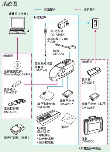 | 选购配件 | 硬盒、充电器和备用电池、定位目标罩、Bluetooth®模块、 SpectraMagic™ DX软件 | |