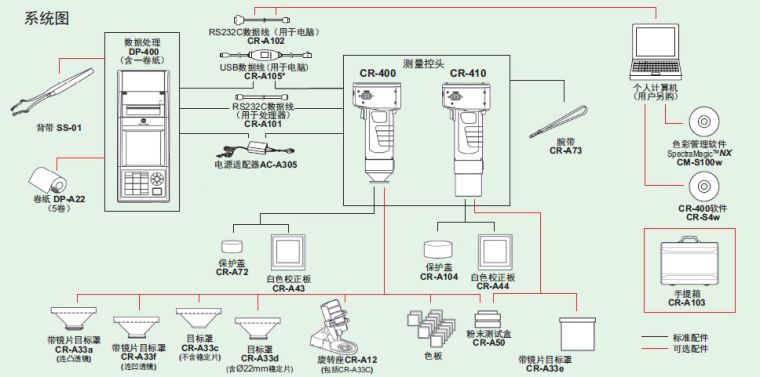 由于采用的是色差基准色的设定及校正等容易识别的按钮名称,所以测量和设定操作均简便易行。具备重复性ΔE*ab 0.07以内、仪表误差(ΔE*ab 0.6以内/CR-400;ΔE*ab 0.8以内/CR-410)的高精度。使用任意校正功能可以获得更高水准的精度。(使用数据处理机或另售的配置软件加以设定。)可设定临界值评价确认结果(合格/警告/不合格)(使用数据处理机或另售的配置软件加以设定。)加载到CR-300和CR-310的色度图上,可选择有更多颜色的色度图。使用测量头单体时可保存1000条测量数据,连接使用数据处理机时可保存2000条数据。(色差基准色数据在使用测量头单体时和连接使用数据处理机时都可保存100条数据)由于也可使用色差表表示,所以色差的状况可以通过目视确认。(使用数据处理机时)色差基准色的说明文字和校正通道名的输入都采用简便易行的手机短信输入方式操作。(使用数据处理机时)清晰、精确的背光液晶显示画面。液晶显示画面上可选择英语、日语等6种语言。可使用充电电池驱动,经济实用。