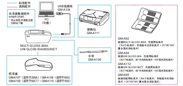 Multi Gloss 268A的测量角度为20°、60°、85°,Uni Gloss 60A/Uni Gloss 60S/Uni Gloss 60CT只能进行60°角测量。