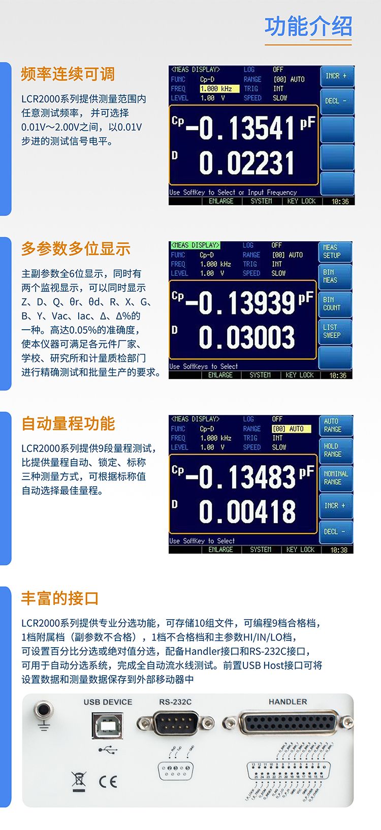 + 测试频率连续可调 + 基本准确度 : 0.05%