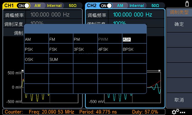 | 调制方式 | AM、DSB-AM、FM、PM、ASK、FSK、PSK、BPSK、QPSK、3FSK、4FSK、OSK、PWM、SUM |