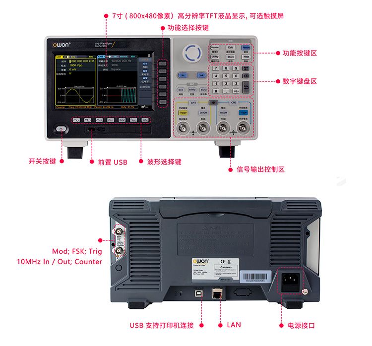 + 7寸 ( 800x480像素)TFT液晶屏,支持触摸操作,多点触控方便快捷,可快速改变波形参数,通过触摸屏还可以编辑绘制任意波