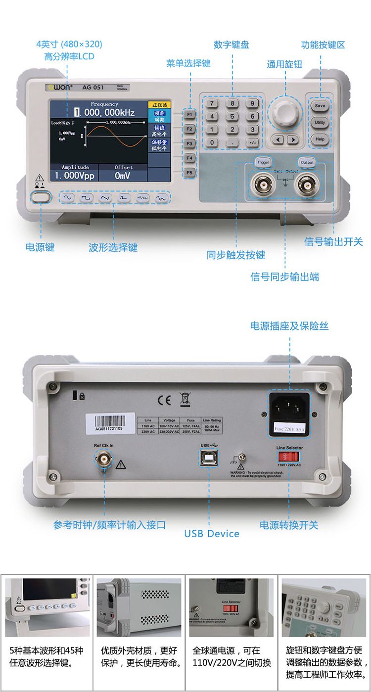 + 丰富的调制功能:AM、FM、PM、FSK、PWM 以及输出线性/对数扫描和脉冲串波形