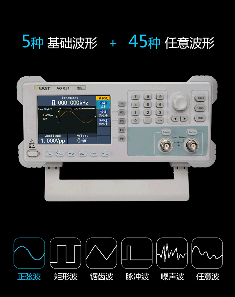 + 丰富的波形输出:5种基本波形,内置45种任意波形