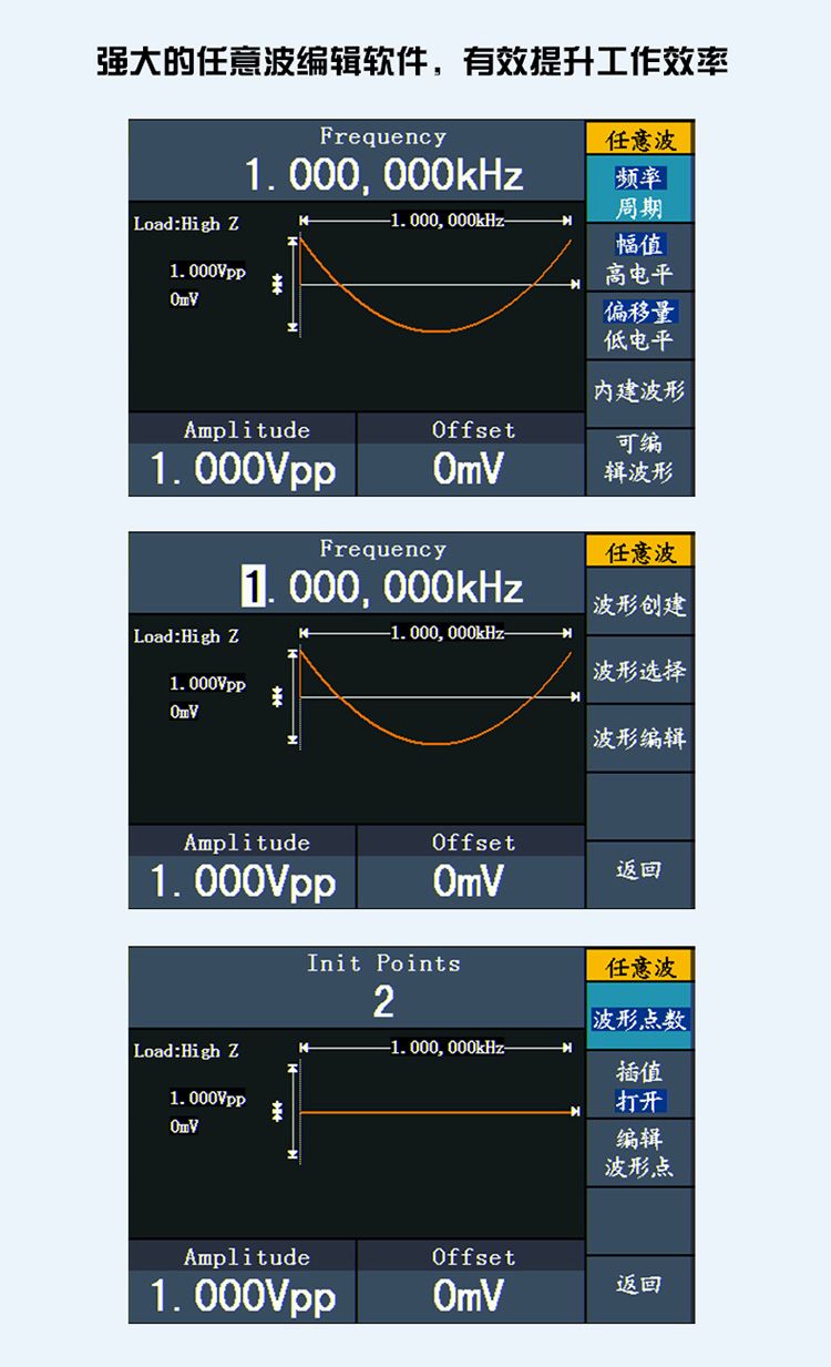 | 任意波形 | 指数上升、指数衰减、Sin(x)/x、阶梯波等45种内建波形以及用户自定义波形 |