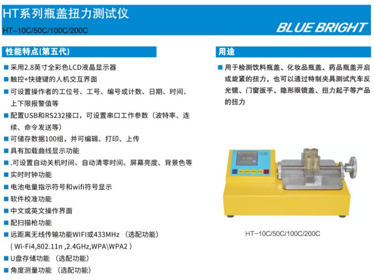 用于检测饮料瓶盖、化妆品瓶盖、药品瓶盖开启或旋紧的扭力,也可以通过特制夹具测试汽车反光镜、门窗扳手、隐形眼镜盖、扭力起子等产品的扭力