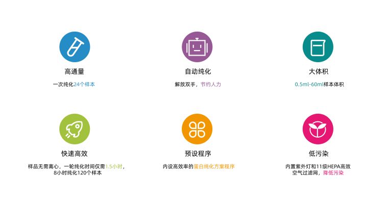 PP24高通量自动化蛋白纯化工作站是一款磁珠法自动纯化设备,纯化效果媲美传统的亲和层析柱法,具有高通量、自动化、大体积、快速便捷等优点。搭配知禾自主研发的抗体或蛋白纯化磁珠,可为客户提供高通量、高回收率的自动化蛋白纯化方案。