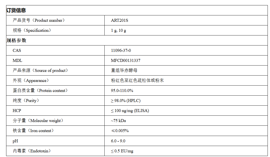 | ART201S | ≥ 98.0% 干粉 | 10g | - |
