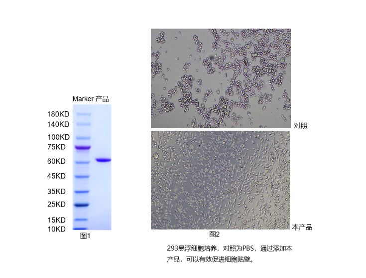 生物活性 | 具有促细胞贴壁作用(图2),根据细胞类型不同,最适使用浓度为0.2-1.5μg/cm2 |