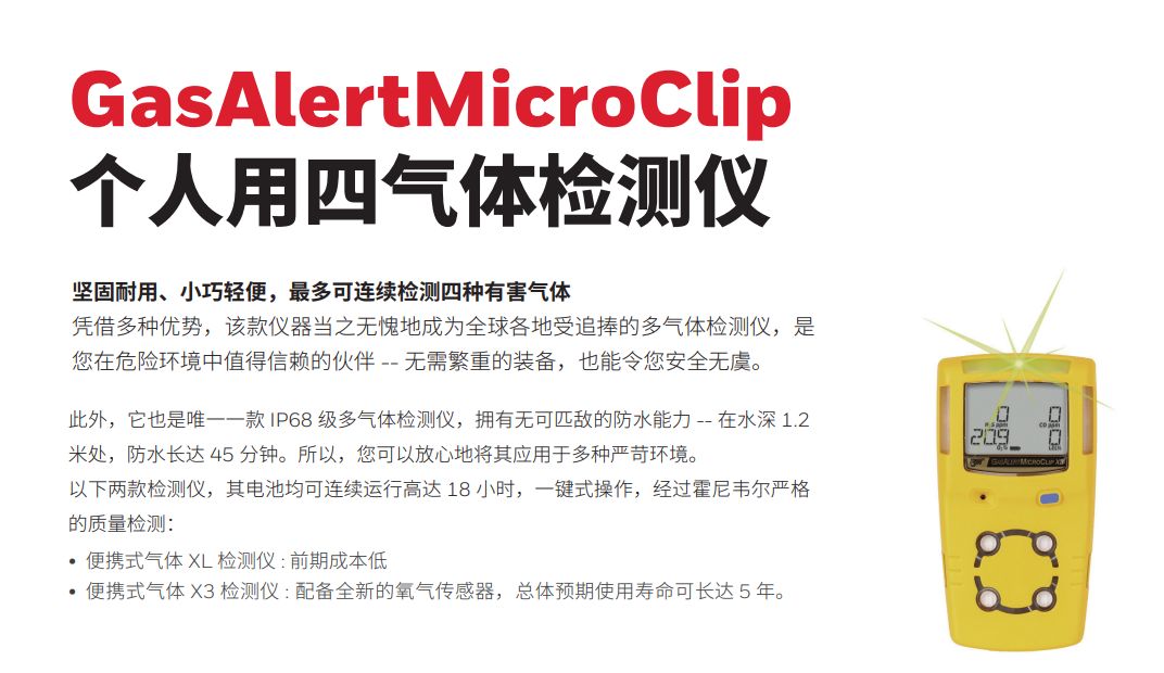 坚固耐用、小巧轻便,最多可连续检测四种有害气体凭借多种优势,该款仪器当之无愧地成为全球各地受追捧的多气体检测仪,是 您在危险环境中值得信赖的伙伴 -- 无需繁重的装备,也能令您安全无虞。此外,它也是**一款 IP68 级多气体检测仪,拥有无可匹敌的防水能力 -- 在水深 1.2米处,防水长达 45 分钟。所以,您可以放心地将其应用于多种严苛环境。 以下两款检测仪,其电池均可连续运行高达 18 小时,一键式操作,经过霍尼韦尔严格 的质量检测:• 便携式气体 XL 检测仪 : 前期成本低• 便携式气体 X3 检测仪 : 配备全新的氧气传感器,总体预期使用寿命可长达 5 年。