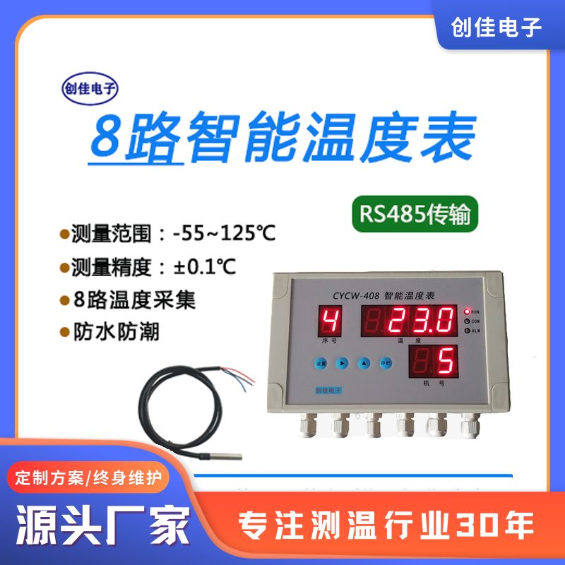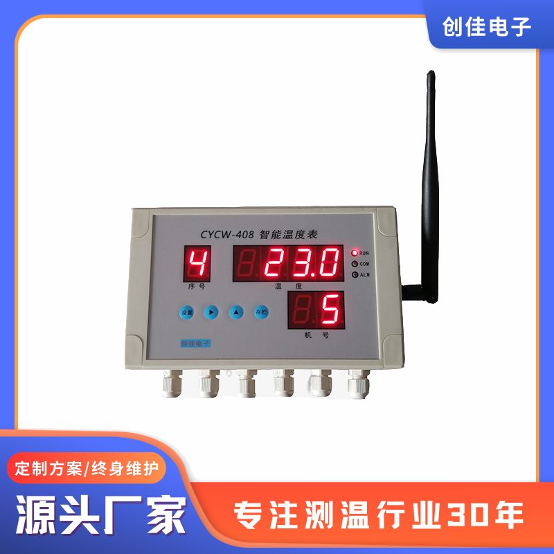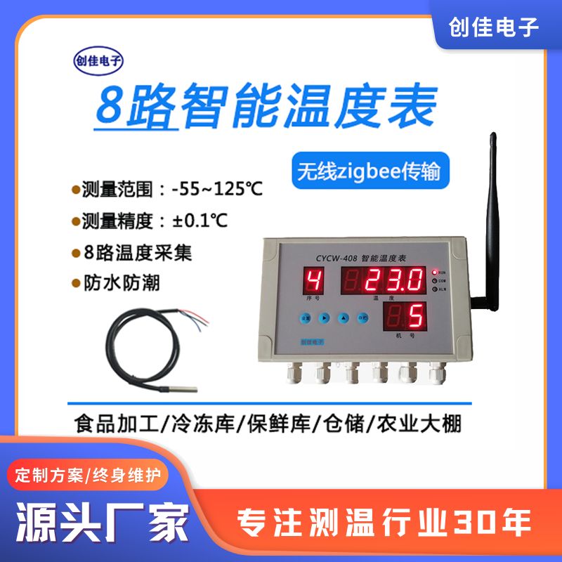 CYCW-408大棚温度智能化控制器升降温控制水位喷雾专用温度表是一款防水,多点测温智能控制,支持无线通信的温度仪表。CYCW-408温度仪表(温度监控系统高精多路采集保鲜速冻食品车间)功能强大,适用于食品加工、冷藏库、保鲜库、医药、农业大棚等行业。