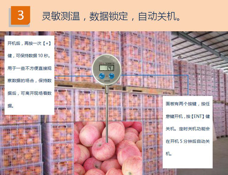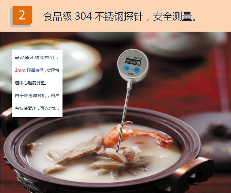 CYBT-6 便携温度表 用于测量空气、液体、果实内部、食品内部温度,是一款便携式 手持式 探针式温度计,核心采用16位单片机,配合进口PT1000温度传感器,达到了很高的测量精度。采用不锈钢探针式封装,经过特殊工艺处理,反应速度快,便于使用。整机采用防水设计,适合潮湿环境使用。由于采用单片机,用户有特殊要求,可以定制。