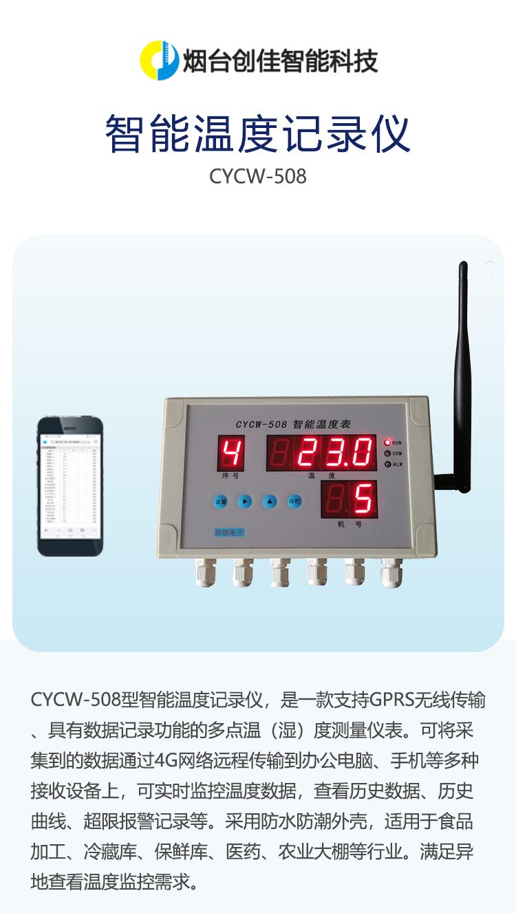 CYCW-508智能温度仪表是一款支持GPRS无线传输、具有数据记录功能的多点温(湿)度测量仪表。采用防水防潮外壳,适用于食品加工、冷藏库、保鲜库、医药、农业大棚等行业。