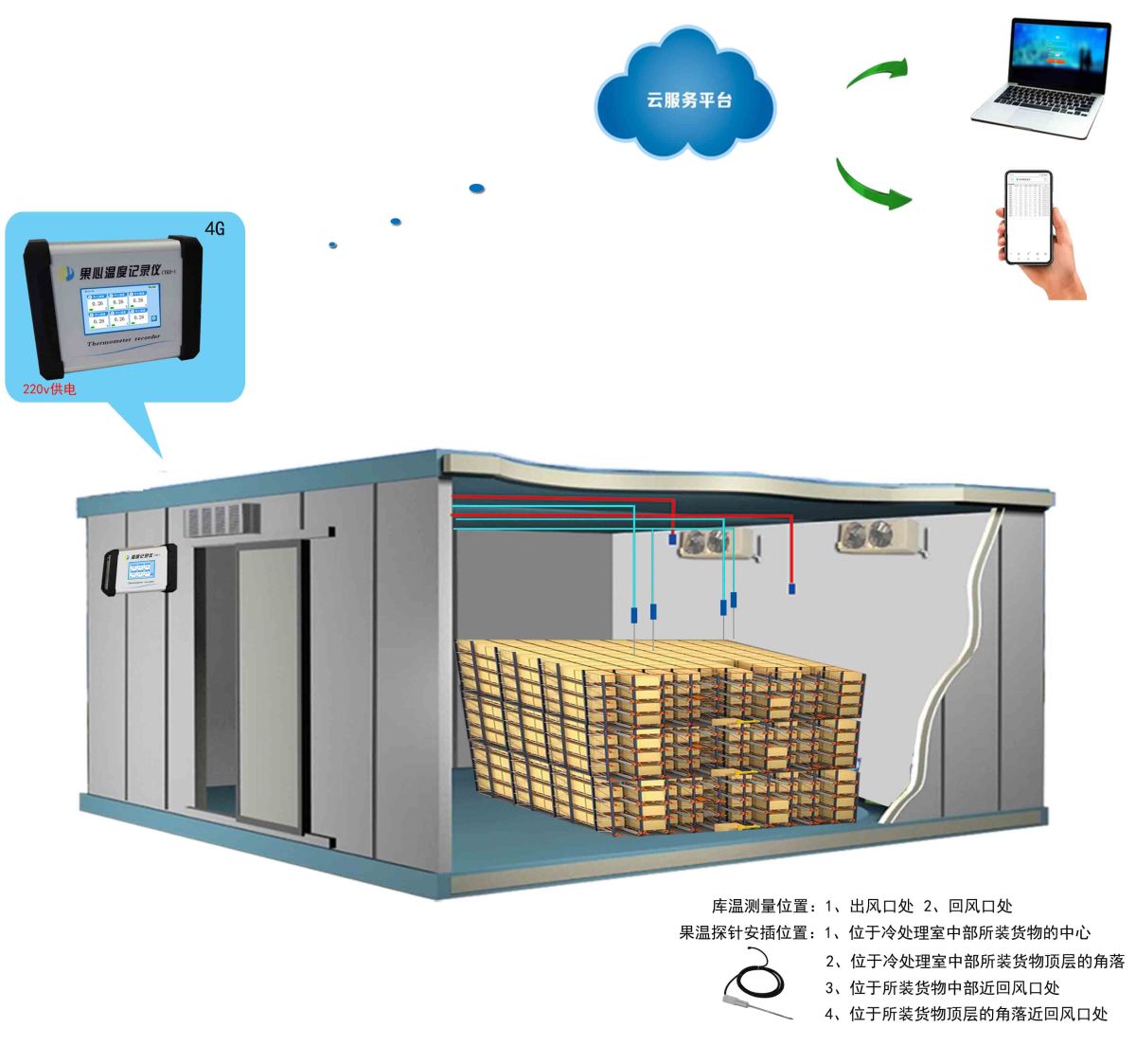 l 采用高精度芯片实现温度测量,可同时测量4个果心温度和2个环境温度。