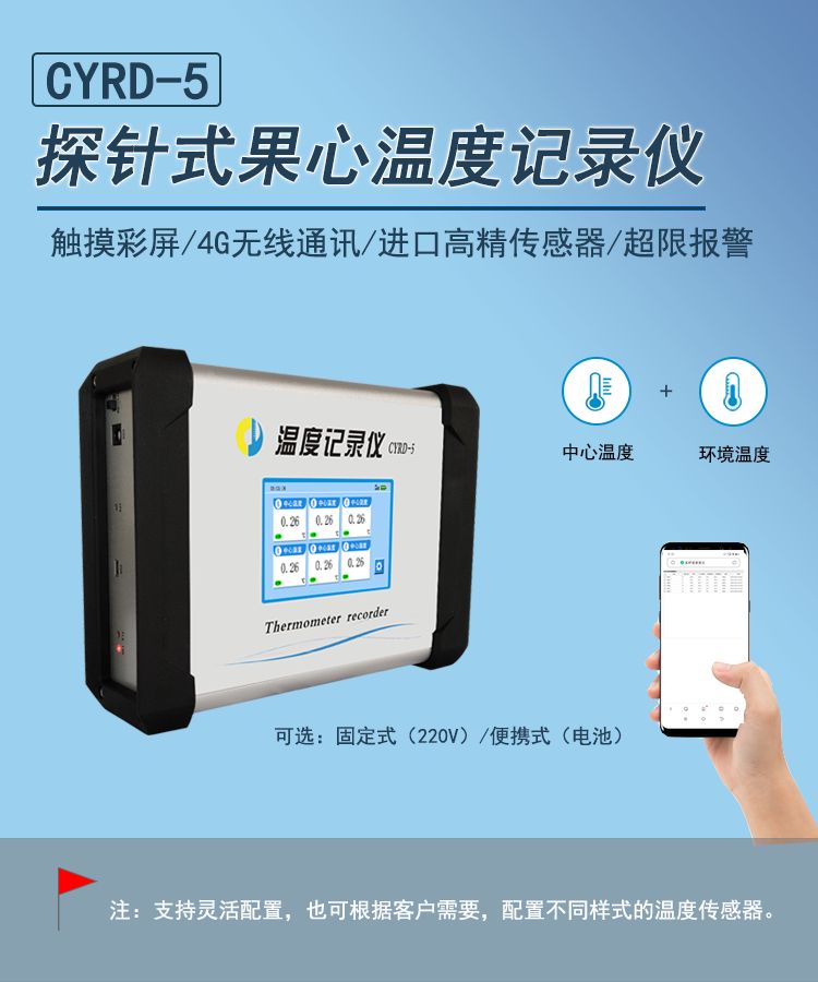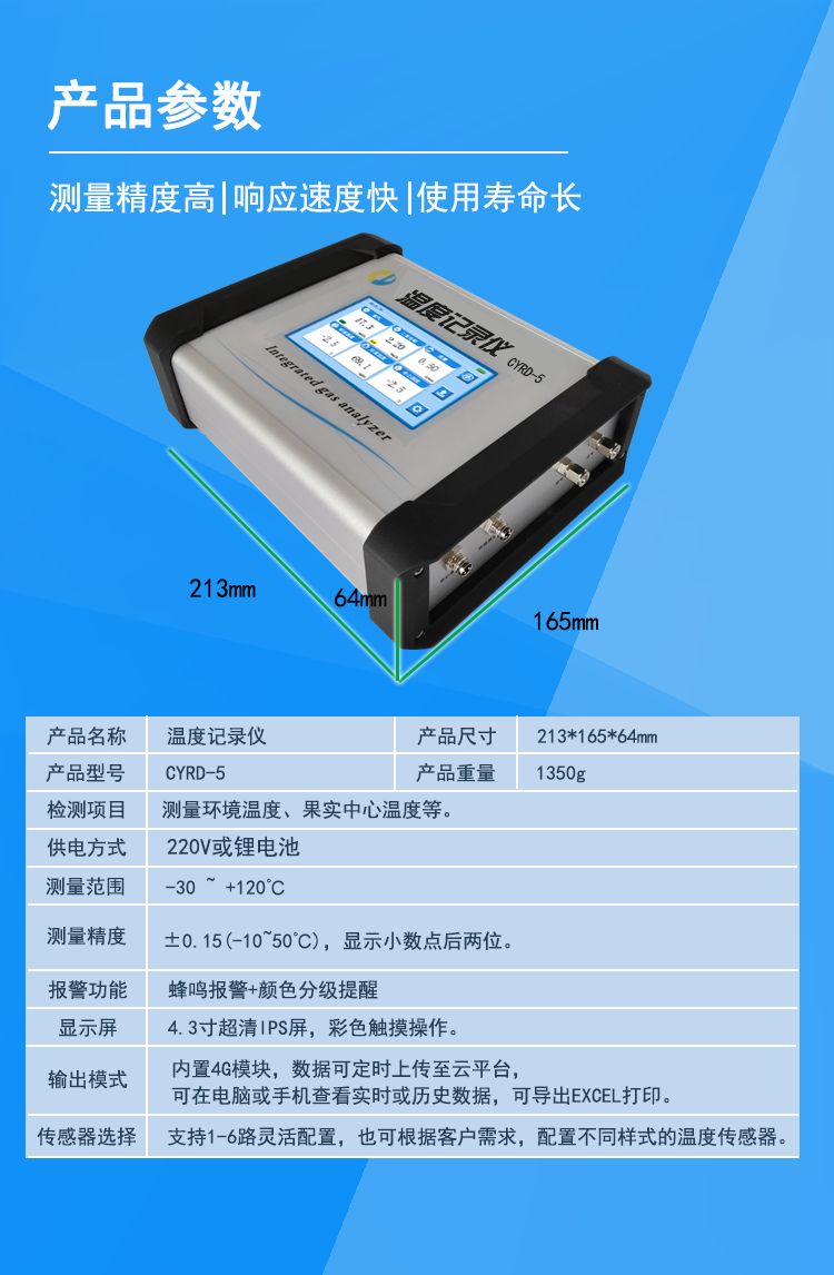 CYRD-5果心温度记录仪针对冷链应用开发的一款专用仪器,其主要功能是测量和记录环境温度或中心温度数据,采用彩色液晶显示,实时显示多个测点的测量结果和各种参数,可对上限、下限报警。配有4G模块及时间电路、数据定时上传到云平台,用户可登录网站查看实时和历史数据。该仪器广泛适用于果蔬保鲜行业、科研应用等领域。