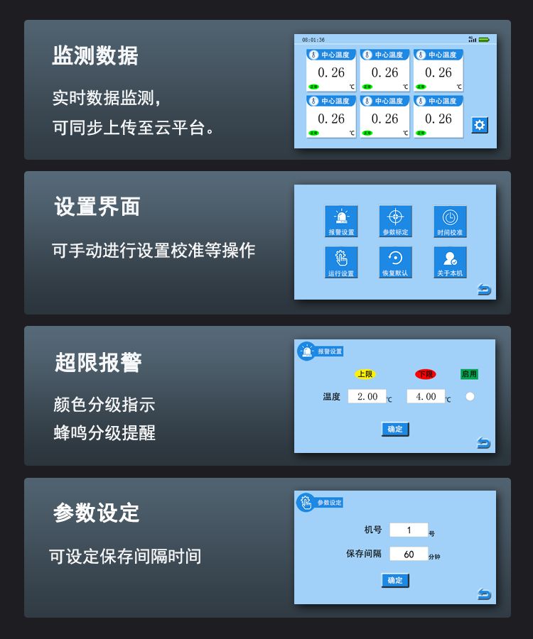 l 支持超限报警功能。当温度超限时,在液晶屏显示报警信息,发出提示音。