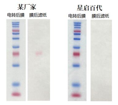 相同电转条件下,部分蛋白分子已经透过某厂家的转移到滤纸上,而我司的则能更好的结合蛋白分子,使其保留在膜上。