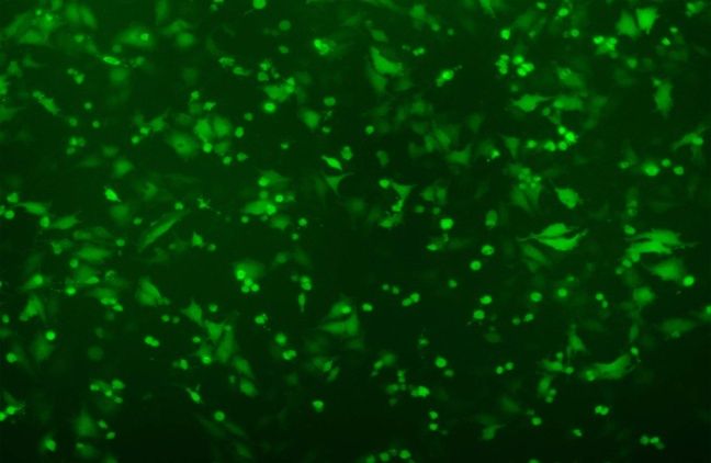 图A我们的试剂 转染0.8μgGFP质粒于Hela细胞,转染阳性率高达90%