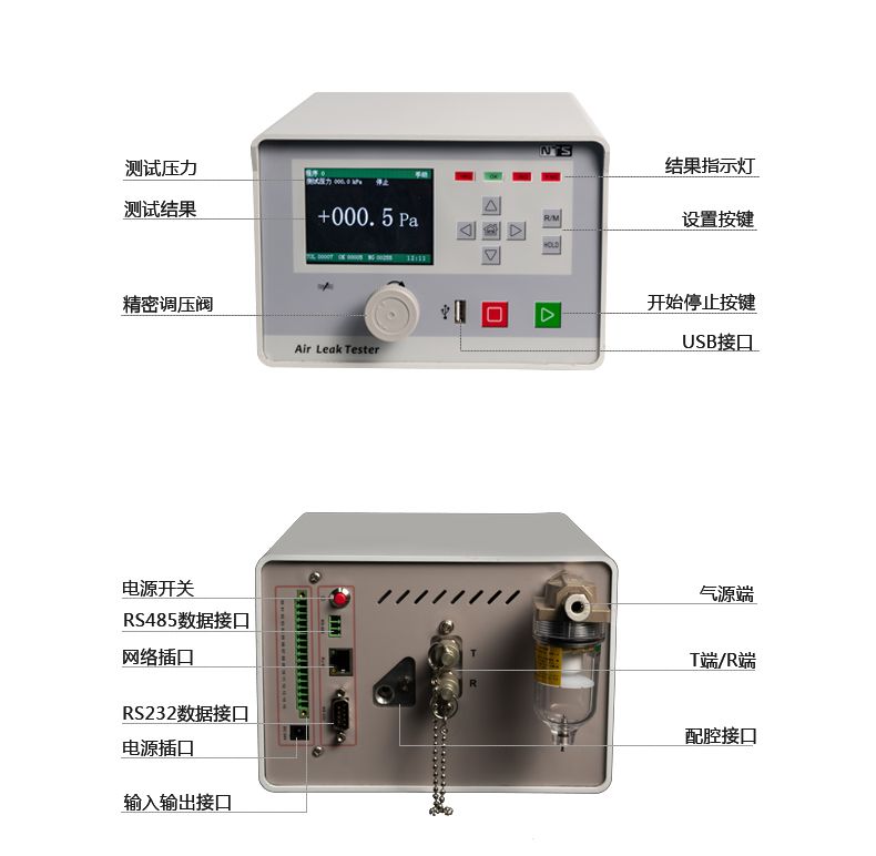 气密检测仪采用高精度的电子压力传感器,按要求提供稳定的检测气源,然后通过检测仪充气到被测产品上,当内部压力达到检测压力后,气体经过短时间的稳定后进入检测阶段。没有泄漏时检测压力基本保持不变,存在泄漏时工件内的气体压力随着气体从被测产品中泄漏而逐步下降,压力传感器实时输出相应的压力变化,进而按照预先设置的参数,系统自动判断是否泄漏,检测过程完全消除了人为因素的影响。
