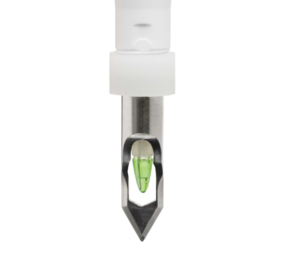 FC098 是一款 20 mm (0.8'') 长的不锈钢穿刺刀片,与 Hanna Instruments Foodcare pH 电极配合使用,旨在测量肉类的 pH 值。该刀片允许轻松切成肉,以便pH电极与内部肉制品接触,同时保护其免受破损。图中所示是连接到单独购买的 pH 电极上的刀片。