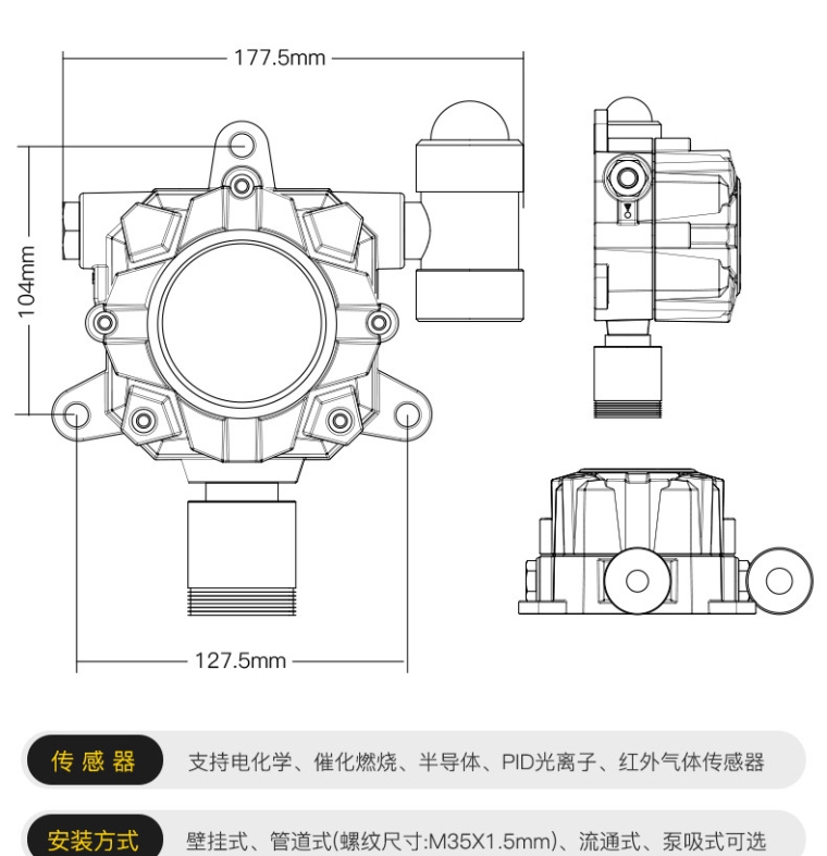 安装方式 | 壁挂式、管道式(螺纹尺寸:M35X1.5mm)、流通式、泵吸式可选 |