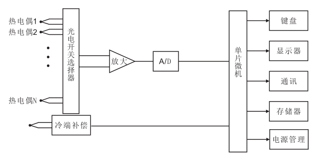 如图所示,仪器由热电偶、光电开关选择器、放大器、A/D、单片微机、键盘、显示器、通讯、数据存储器、电源管理、冷端补偿等部分组成。