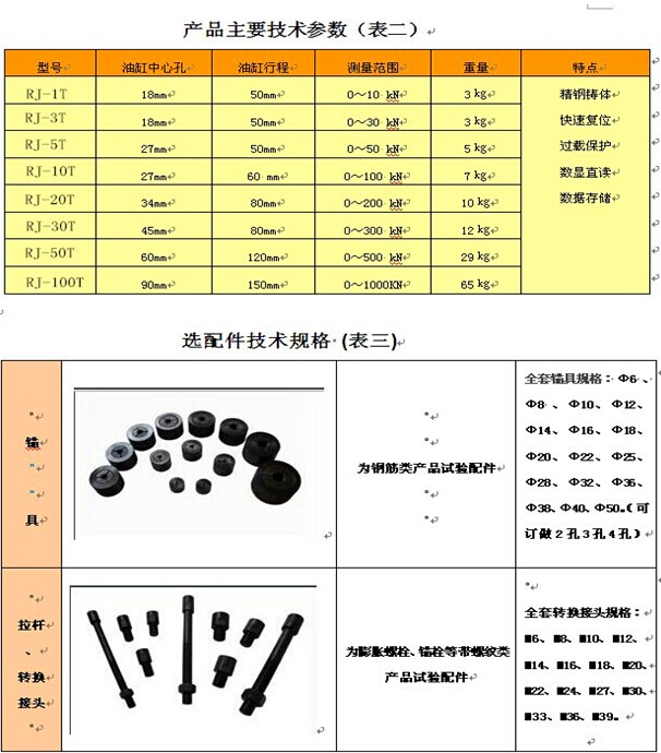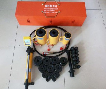 RJ-1T/3T/5T10T/20T/30T/50T/100T型锚杆拉拔仪是由手动泵或电动泵、中空液压缸、数显压力表、带快速接头的高压油管、锚具、拉杆、转换接头和手提便携箱组成。1~30吨液压缸为中空自复位式,50~100吨液压缸为中空手动或电动复位式,可加分级卸荷功能。本仪器中的数值显示部分为一体式多功能显示仪表,可直接读取锚杆拉力值(KN),并有自动计算、峰值保持、存储和查询功能,特别适合试验室和现场使用,操作简单,易学易用。