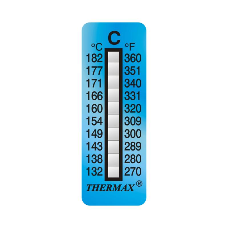 英国Thermax(TMC)10格A/B/C/D感温贴纸是十格热敏试纸,测温范围为测温范围为40~71℃/77~127℃/132~182℃/188~249℃,垂直自动黏贴式,感温贴纸同时有摄氏度和华氏度值。10格A/10格B/10格C/10格D感温贴纸是英国温度美牌原装进口的产品,采用的材质具有防水防油的优势,是不可逆的感温贴纸。