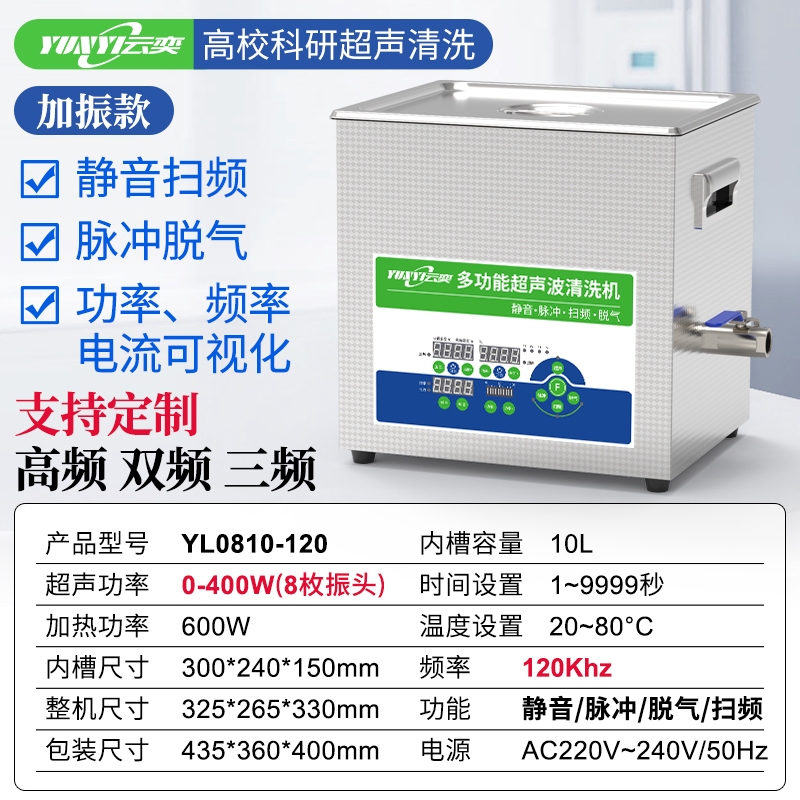 超声波在长时间运行期间会加热清洗剂,云奕实验室超声仪使用全桥它激式线路板和振头高度匹配,发热量低,能缓解限制液体升温性能更加稳定,使用寿命更长。