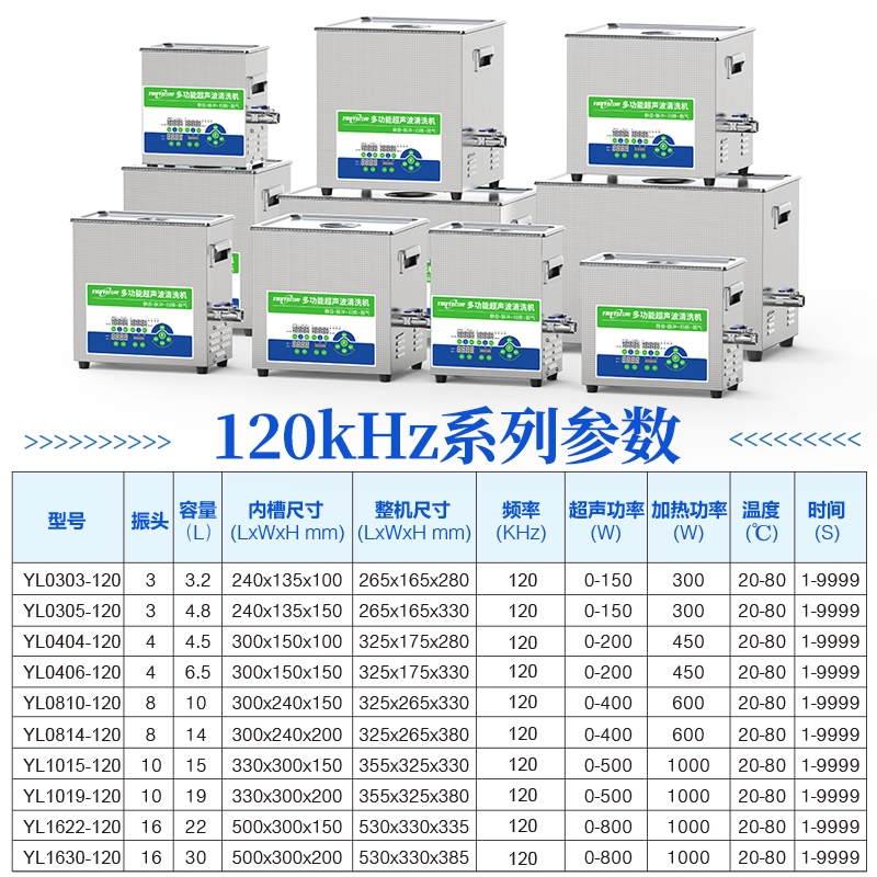17-28 KHz - 消除重油重锈顽固污渍的合适频率。请勿使用在镜面抛光表面和玻璃,铝等敏感材料。