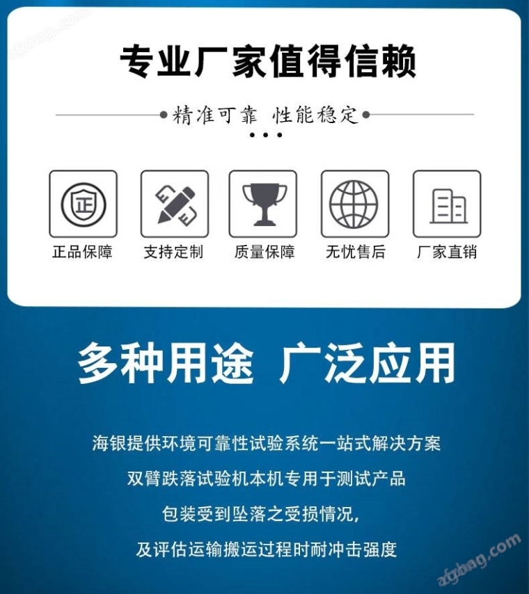 运用领域:包装行业:用于测试包装箱、托盘等包装材料的抗跌落性能;电子产品:评估手机、平板电脑等电子设备在跌落时的耐用性;汽车零部件:测试汽车零部件的抗冲击能力;玩具行业:确保玩具在跌落时不会对儿童造成伤害。