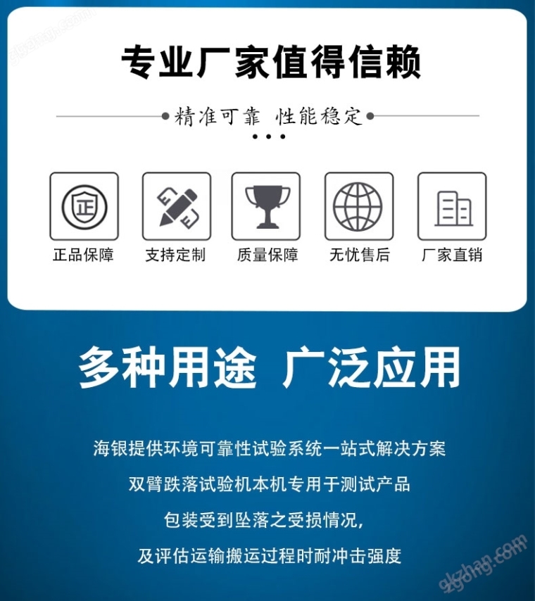 广泛运用于包装行业、电子产品、汽车零部件、家电行业等领域,在测试过程中,确保人员远离跌落区域,避免意外伤害;定期校准,定期对设备进行校准,样品固定,确保测试结果的准确性;确保样品在测试过程中固定牢固,避免因固定不牢导致的测试误差。