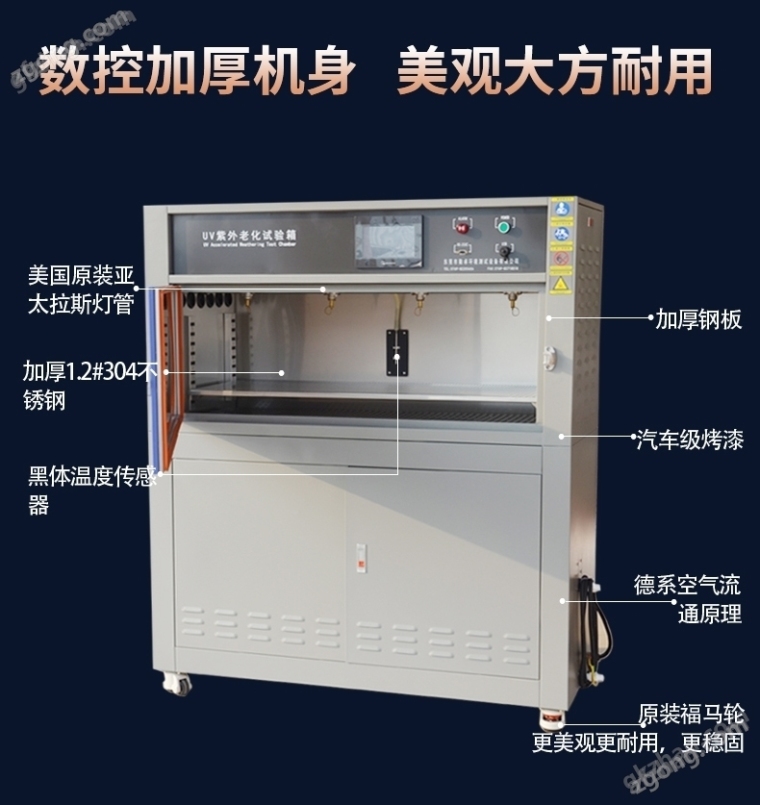 紫外线照射通过UV灯管发射,模拟太阳光中的紫外线辐射;温度调节通过加热元件和制冷系统调节箱内温度,模拟不同环境温度;湿度调节通过加湿器和除湿器调节箱内湿度,模拟不同湿度条件;样品暴露将样品放置在测试箱内,接受紫外线照射和温湿度调节,进行老化测试。